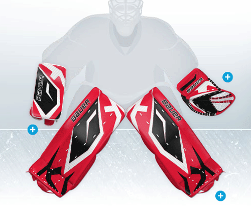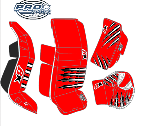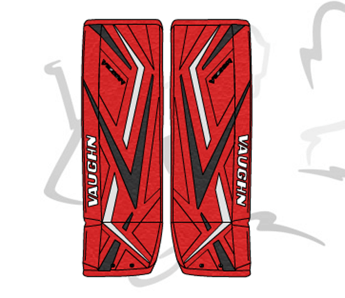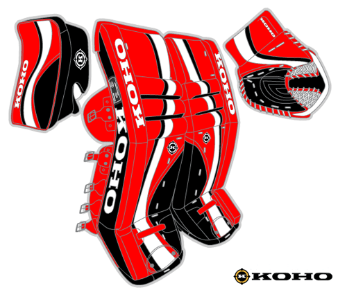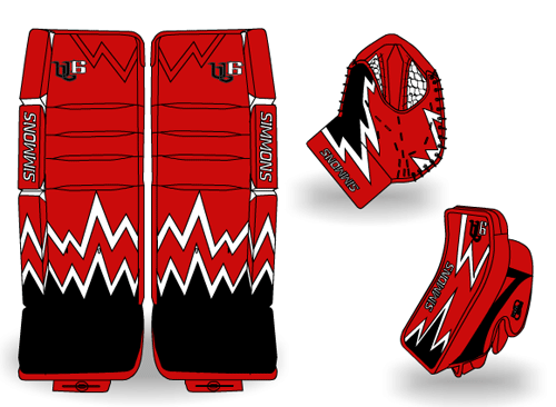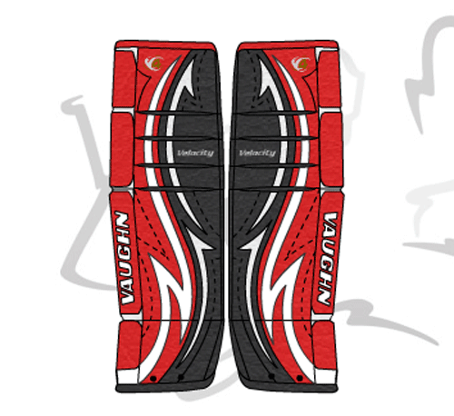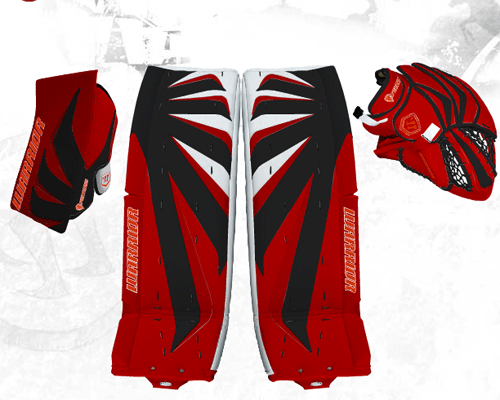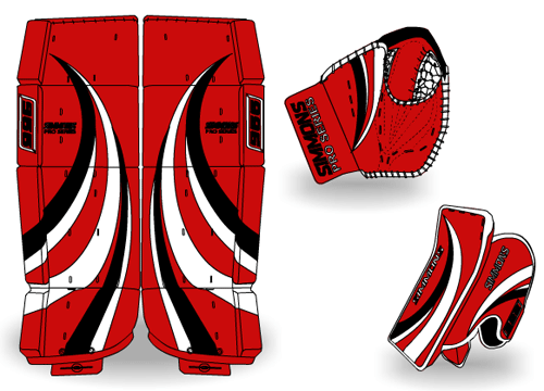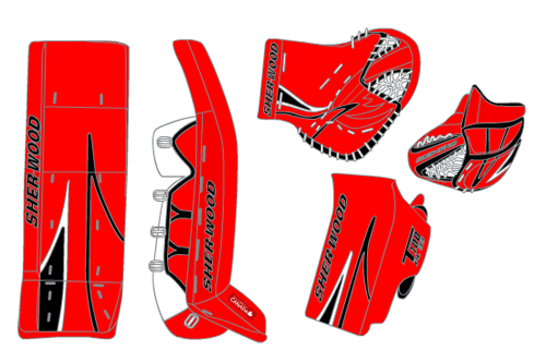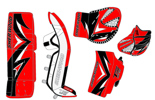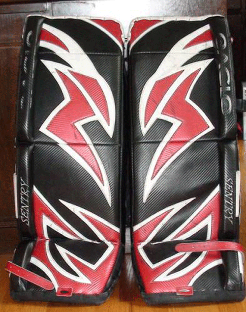 I wear a set of Sher-Wood 9980 goal pads in red, black and white very similar to what Patrick Lalime wore as an Ottawa Senator in the early 2000s.